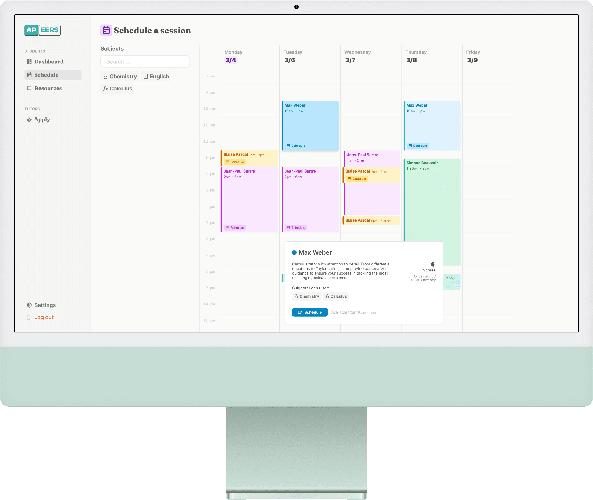 scheduling software for peer tutoring organization APEERS // designed in Figma