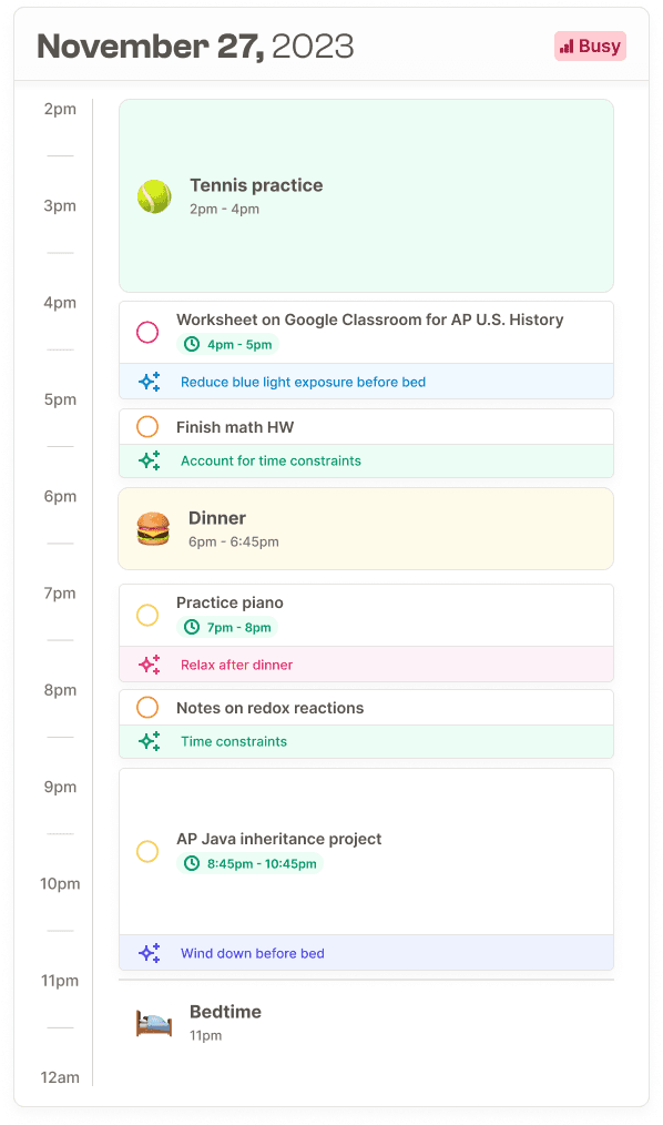 My basic idea was that we could use ML/AI to more efficiently organize a schedule. Users would prioritize their tasks into priority levels 1, 2, or 3, and give an approximate estimate for their duration. The software would then take over from there, creating your schedule while accounting for events already on your calendar (e.g. swim practice, violin lessons, the movie trip you never thought would make it out of the group chat, etc.) as well as more subjective factors like reducing blue light exposure near bedtime.