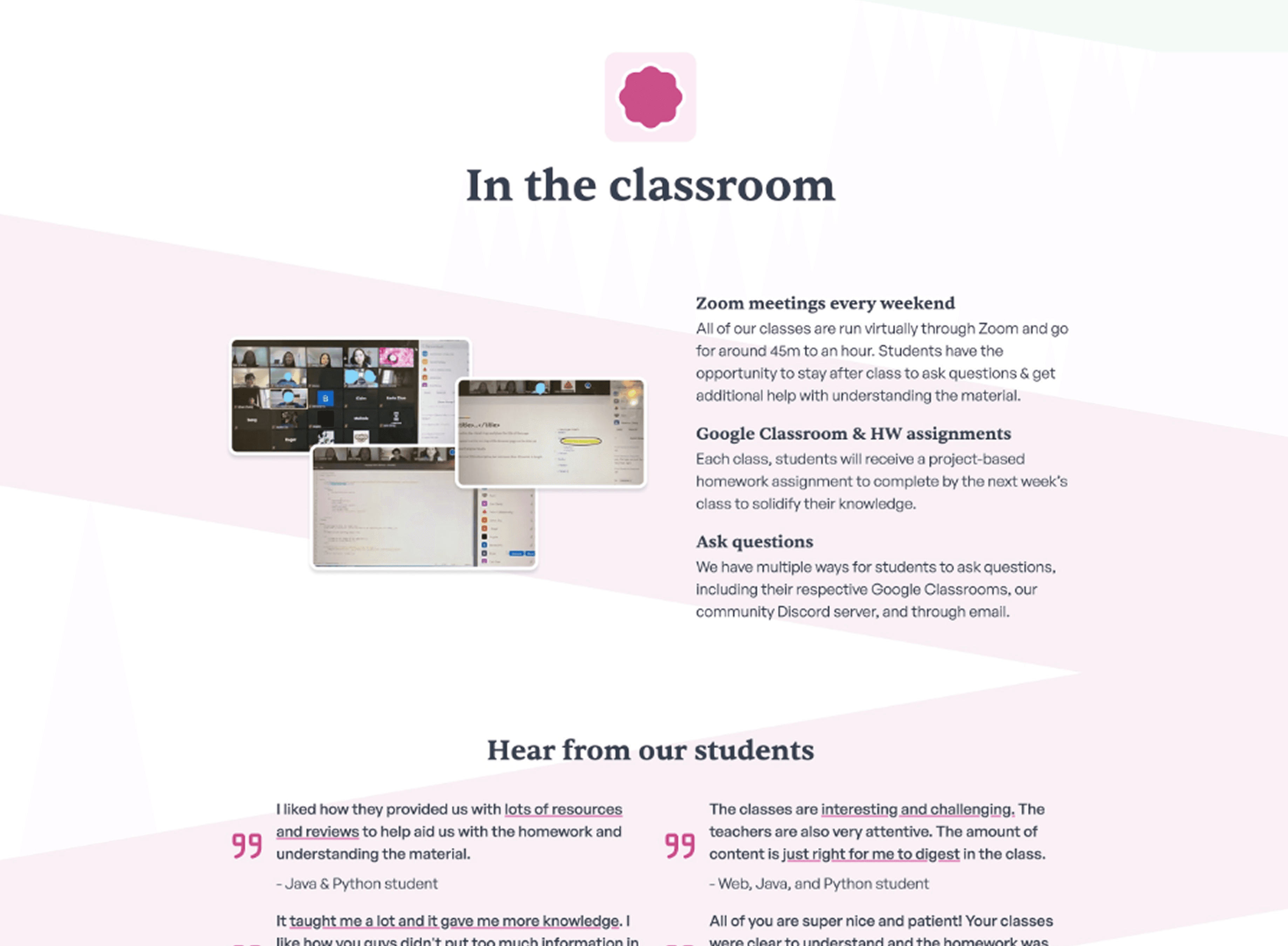Below, you can see a few stats about our programs and organization as a whole: students taught, number of teachers, courses offered, average parent satisfaction (from student surveys).